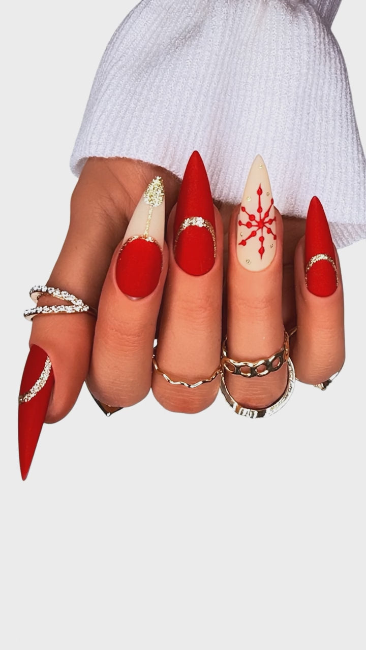 This handcrafted press-on set combines rich matte reds, crisp nudes, and high-precision gold detailing for a look that instantly stands out. The snowflake accent nail adds a polished seasonal touch without feeling cliché.
