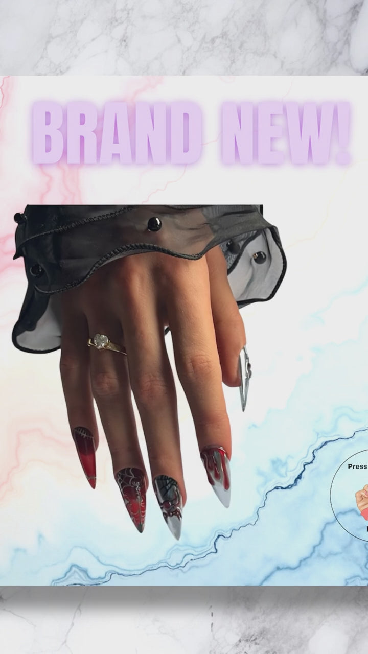 Enter the realm of gothic glamour with Dark Web. A fierce fusion of deep blood-red and metallic chrome, detailed with haunting designs — webs, skulls, and drips of dark magic. Perfect for anyone who dares to stand out